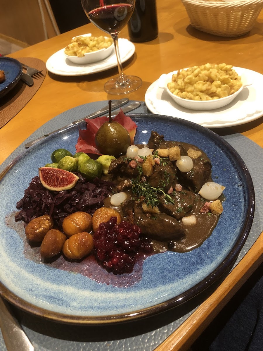 Wir kamen nun zum Auftakt der Wildsaison. Herrliche Kürbissuppe wie vom Grossi hausgemacht. Anschliessend einen herrlichen Hirschpfeffer richtig fein garniert mit allen klassischen Zutaten. Auch hier riecht und schmeckt man das ist mit Herzblut alles frisch zubereitet. Für Wildliebhaber eine Empfehlung und ein sicherer Wert. Auch die Weinauswahl dazu lässt keine Wünsche offen. Zudem sind das Essen und die Weine richtig genussfreundlich kalkuliert. Ein grosses Bravo an Alline und Kevin, wir kommen sicher wieder!!